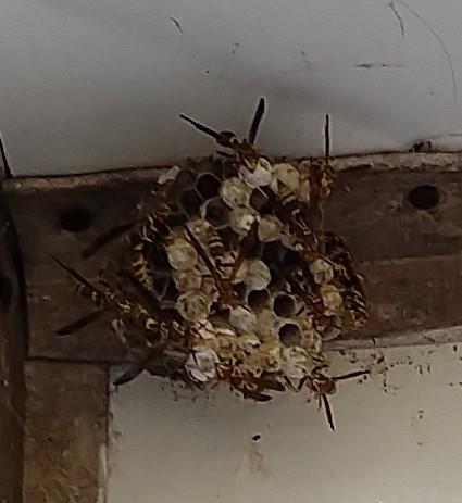 🪲 Possible cobweb or dust around | Slight dust around wooden edge | Neglected nests accumulate debris — wasps don’t clean abandoned sites. |